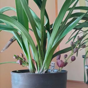 シンビジウム 5本、つぼみが上がって来てくれてます。 初めてのことなので、見つけた時は嬉しくて☺️☺️ 2枚目は、お隣さんから「育てられないから」と持ってきていただいた時の写真。 どの子が咲いてくれるのか楽しみです😊