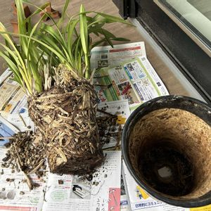 今年は花が咲かなかったシンビジュウム。予想通り、鉢いっぱいに根が回ってました。意を決して、2つに分割! 来春は咲くかな?