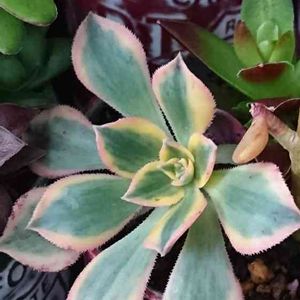 アエオニウム 夕映え いつ紅葉するのかな?🍁と思ってましたが、今頃になって葉先が少しピンク色になって来ました。 外に出してあげたいけど、今年いっぱいは日中もお日様が望めないようです。 頑張って色付いて欲しいです。 頑張れ!夕映えさん☀️