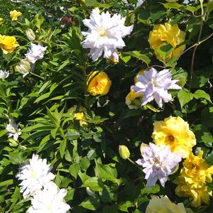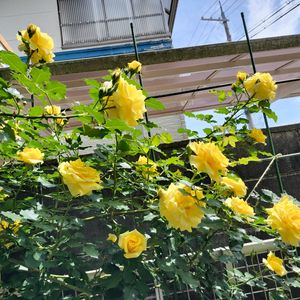 我が家のつるゴールドバニーはもう4年目になります。毎年勢いは増すばかり😆フェンスに誘引中です!大輪の花を既に何十個も咲かせています💛