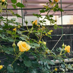 こんばんは😊 フェンスに誘引しているゴールドバニー🌹 だんだんと咲いてきています😆 満開が楽しみ〜✨