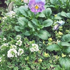 。゚•┈୨ 今日のお花 ୧┈•゚。 葉牡丹❁.*・゚ パステル系の寄せ植え花壇のアクセントに、濃い色をひとつ入れてみました🎶¨̮ ❁. パンジー シエルブリエ ❁. アリッサム(スイートアリッサム) ❁. 葉牡丹(ハボタン) ❁. ディコンドラ(ダイカンドラ)シルバーフォールズ