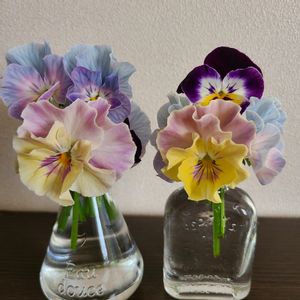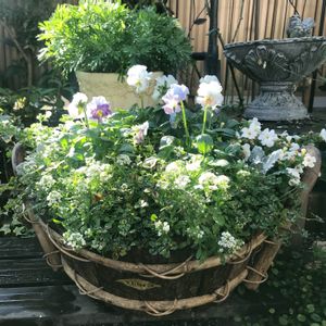 右上:ファルファリアNo.24 右下:レディ 左上:シエルブリエ 左下:品種不明の試作品 どれも個性豊かで可愛いパンビオちゃん達。左下の紫のフリフリはドラキュラみたいだけど違うそうで、別の生産者さんの試作品なんだとか。 寄せ植えを作ったりしたいのだけど、バラの土替えに追われて出来ず😅とりあえずバスケットにまとめて楽しんでいます!早く土替えを終わらせてパンビオに集中したい(笑)