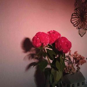 前投稿の夕焼けを撮った後、振り返ると部屋の壁が夕焼け色に染まって… 飾っていたピンクのケイトウとリンクしてました