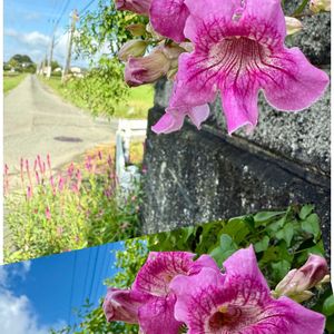 ピンクノウゼンカズラ 9月末〜10月初めに咲き始めて 毎年投稿している お隣さんちの花🌸 塀の外に伸びています𓂃𓏲𓆸 ラッパの形🎺⿻*♩♡∮ 派手な模様入りです♪ 下にはセロシアも咲いてます🕯️💗 昨日の午後は 短時間に大雨降りましたが 今日は思った以上に青空に☀️💙