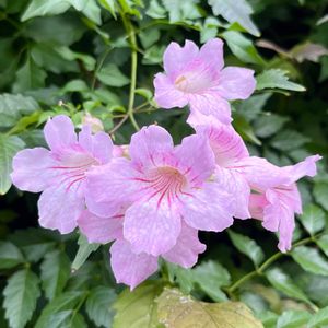 🌸 ピンクノウゼンカズラ 薄ピンク色のトランペット形の花を咲かせ、花びらの内側には濃いピンクの脈がいくつか入ります。 ⚫︎ノウゼンカズラ科 ポドラネア属 ⚫︎原産 南アフリカ ⚫︎花期 6月〜9月