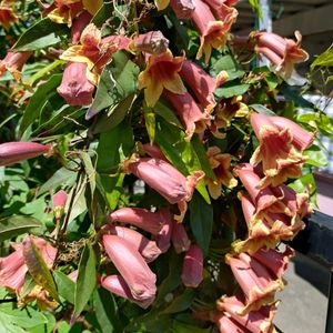 つる性植物🌀 初夏に咲く花は釣鐘状になる 花は直径5cmほどの漏斗形 先端は五つに裂け 花筒の内部は黄褐色 その外側は赤褐色 ✳️シベは花冠に密着していて 見えません👀 釣鐘葛(つりがねかずら) 別名 カレーカズラ ノウゼンカズラ科