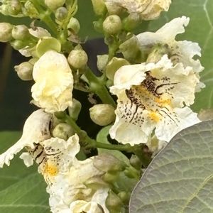 枝の先から漏斗状で淡い黄色の 内側に紫色の斑点がある花 🔰初めましての花です🔰 果実は50cmほどの細長い 豆果です(4年前に見て👀 花を見てみたいと思うが💦 コノ時期 梅雨と体調不良) やっとヤット念願の花🎶 葉🌿は大きくキリの葉に似てる 木大角豆(きささげ)の花 ノウゼンカズラ科