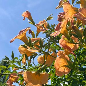 🌀つる性落葉小高木🌀 直径約6~7cmの橙黄色の花 花房は垂下し 広い漏斗形 先端は平開します🎶🧡 凌霄花(のうぜんかずら) ノウゼンカズラ科