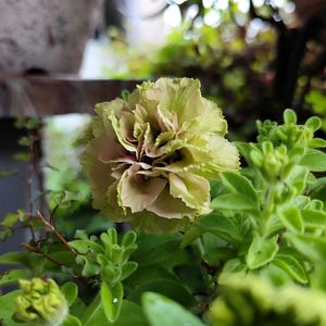 ペチュニア湘南ヴェルデが咲きはじめました♪冬越し大成功❣️ 白にみどりが入る花びらが素敵💓 ミニバラの赤🌹さらに中心が3巻になってるのが咲いてます♪ご褒美かな🤭