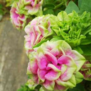 ペチュニア湘南ヴェルデ。 ズームで。 大きめのグリーンと小さめのピンクの寄せ植えです。
