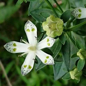 アケボノソウ 林の縁で出会う👸 センブリの仲間らしく、2つずつくっきりとした蜜線溝が見えるけれど、花弁の先に向かった斑点の配置は芸術的(⌒‐⌒) 蕾の外側に斑点が透けて見える 金曜日の蕾たち🏷️