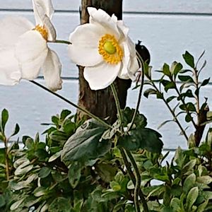 娘の庭からやってきた白い秋明菊。 庭の片隅過ぎるところに植えてしまいました😆ごめんなさい🙏 もたもたしてるうちに開き過ぎて😆🙏 ま、いいか😅😋🙏 可愛いな💕 咲いてくれてありがとう😄💐