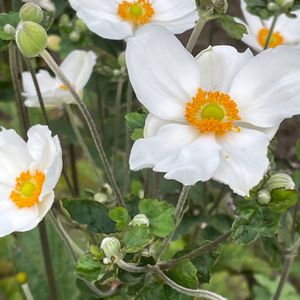 長野庭便り💌𓂃𓈒𓂂𓏸 「秋明菊」①が只今~満開🌸です。台風🌀の☔風にも負けず今日も☔の中でも倒れず咲いております。(斜めだけど💦) この白い秋明菊は種と言うより地下茎で範囲を広げてくる感じです。ほっておくと占領されちゃうので周りはせっせと処分しています💦