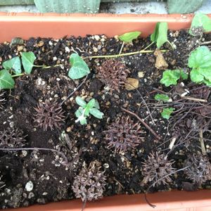ここは集中治療室です😁 猫のトイレ化とされるのでイガイガの実をバラ撒いてます笑 右には枯れ枯れヒューケラが芽吹いてきそうやったのでこの鉢でそこそこの大きさになるまで育てて花壇へ植えようとしてます。アイビーはこの間花壇から引っこ抜いたもの。真ん中のちょこんと植えてるのは昨日見つけた白い花をつけた植物。 なんかねー花が千日紅の白っぽいよ! もうダラリンてしてきたのでカットして触った時に花の質感がよう似ちょった😁 去年このあたりで育てていたから種があったのかもー。 移植したばかりやけん水やりしとかんとね!