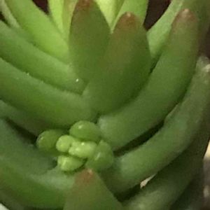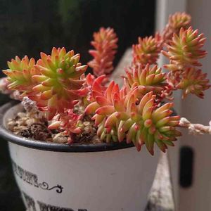 フェイクみたいだけどリアル・多肉ちゃんです。セダム・グリーンペットさん。とっぺんのポッチリ紅葉とねじねじスタイルが可愛い😊