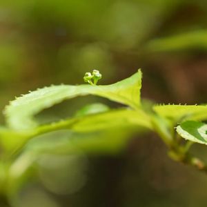 ハナイカダ(花筏) 葉っぱの真ん中辺りに花を付け、夏には黒っぽい実ができます😊 葉の中央に咲く花を「筏に人が乗った姿」に見立てて名が付きました🤠
