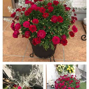 ボンザマーガレット ルビーです。 昨年11月に植え付けました(左下)。 上、右下の写真は4月のものです。その後写真撮り忘れて‥😭今はお花まばらです💦オレアリアはさらに茂っています。もう分けた方がいいのかも。 4/2に投稿した、オレアリアリトルスモーキーとの写真の鉢のおもてから撮った方になります笑 もうマーガレットは切り戻しの時期ですね〜。 皆様のように満開まんまる!って感じにはならなかったですが、それでもとてもきれいな紅いお花が見られて嬉しかったです😊夏越しできますように〜!