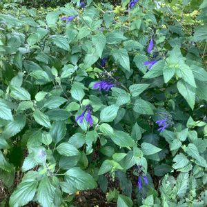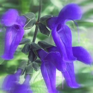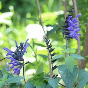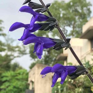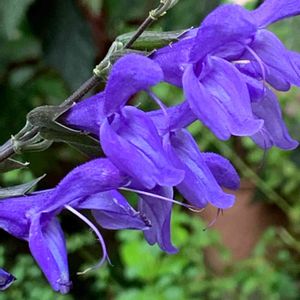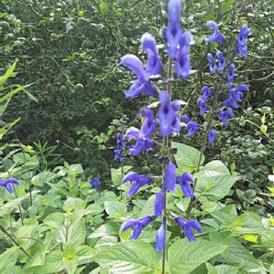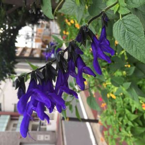 ,日本では本種サルビア・ガラニチカ(Salvia guaranitica)が「メドーセージ」の名前で流通していますが、メドーセージとは本来サルビア・プラテンシス(S. pratensis)の英名です。サルビア・ガラニチカが何故メドーセージの名前で定着しているのかは不明だそうです。 耐寒性・耐熱性ともに強い植物で、草丈は1.5mくらいまで成長する大型宿根草。 花の形は、上下に分かれた花の先が唇のように見えるのが特徴的。病気や害虫に強く、独特の香りを虫が嫌がるので、虫よけとしての効能もあります。 丈が伸びた茎や花が咲き終わった茎は付け根から剪定していまが、我が家では広範囲に広がらないように根元から抜く事も有ります。自己主張強い系の子達ですが、花言葉Sageには賢人という意味から、周囲の人の意見を尊重する、相手を敬うということや知恵を授けるという意味が花言葉に込められていました♡