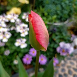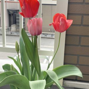 2025.3.24 ①冷蔵チューリップ、第1号が開花間近です。 赤かピンクな予感🩷(5色混合球根) ②全部で5球植えましたが、葉っぱが垂れる。。 簡単そうにみえて、チューリップ、育てるのが意外と難しいのかもっと思いました。 生育も高さがバラバラ😅 日光に均等にあたるように鉢の向きも変えたりしましたが、難しいですね。 5球開花しますように🌈