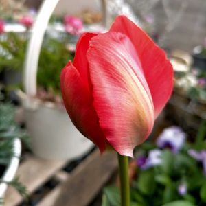 2023.3.27 花の大和さんのチューリップ(冷蔵済)が開花しました(2/5) 色、混合球を混入しましたが、同じ色も入ってるんですね。 残り3球は何色が開花するか楽しみです。 これから全体的に色づいて、形もチューリップらしくなるのかもですね。
