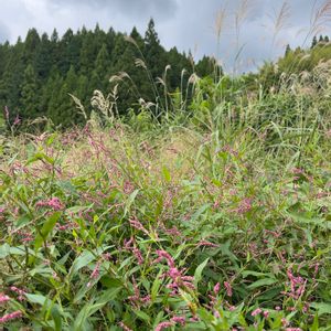 2023/10/01 ☔降ってしまったので昨日の続きは出来ないなぁ… お蕎麦食べに行こう♪ 先月突然お休みになったと連絡来たので諦めたお気に入りのお店へ行ってみよう♪ 連絡入れたら休業にするお電話ワザワザ下さるのだから今日は突撃!(笑) その後只見線沿線に沿って少しドライブ。 いつも休憩する東屋で暫く食休め♪・・・の夫。 私はいつもの様にウロウロ草やら木やらを眺めてました。一面大きな葉っぱは葛みたいです。 そこやらピョコンピョコンと・・・犬蓼や露草に後は何かなぁ?