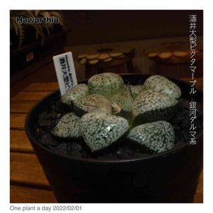 One plant a day. Haworthia 酒井大型ピクタマーブル 銀河ダルマ系 from moorimooi 白いスポットのある窓が破裂しそうなくらいぷっくり盛り上がっています。ダルマ系の特徴なのかな🤔大型という名前の通り大きくなったら綺麗だろうな〜と思わせる株です😉