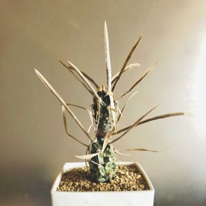 好きな属の1つ、テフロカクタスより黒太刀です。 渋い緑に透けるような黒のボディがカッコイイ。 独特の、薄く柔軟性のある棘は言わずもがな。 正確な学名は分からないのですがうちではTephrocactus platyacanthus var. deflexispinus の札を立てられています。