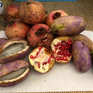 「アケビ」 Rieさんの庭Part5 Rieさんの旦那さんが山で採って来ました。 懐かし~い😆 子供の頃、山に採りに行ったなぁ~ 一つ頂いて食べました😋 懐かし~い!甘い!そして、無言💦種を出すのが大変💦 ごちそうさまでした🙏