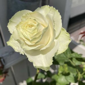 うどんこ病患いながらも 越冬バラ組⑫番目に 「わかな」が咲きました クリーミーエデンにも似ていますが 花弁の縁取りが緑🟢色です 三年前の母の日プレゼントに次男夫婦から頂戴したバラです😅😂