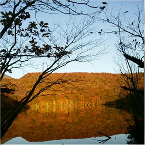 こんばんは🌙 青森県十和田市にある蔦沼が水鏡になって美しい 紅葉時には真っ赤な世界が広がるとか…