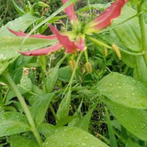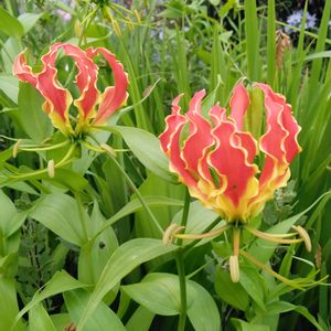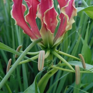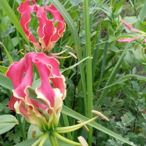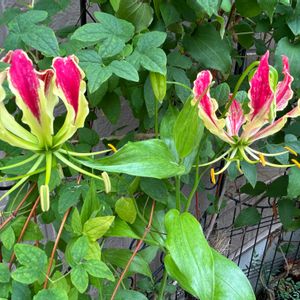 グロリオーサ開花 クレマチスにしがみつくように咲いてます。