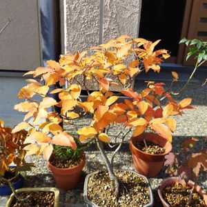 取り木で作ったコムラサキの盆栽が少しですが実をつけました。根上がり+株立+吹流しに仕立ててみました。