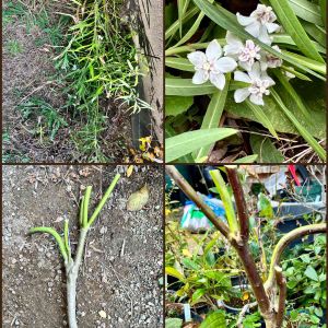 鉢植えのフジバカマ。 ↖️地上部を切り、庭にまで伸びていた根も切断し、プラポットにストンピングを食らわしてようやく引っこ抜けました_:( _ ́ω`):_ゼエゼエハアハア ⬇️もう来年の芽が沢山🌱白くて太い根も御立派! ↗️庭の片隅に植えて、枯れ枝を沢山被せておきました。