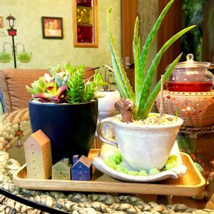 ダイニングキッチンでのカフェスタイル。手元の多肉を眺め眺めながらの一服。