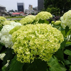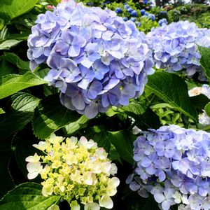 今日のお花、アジサイ、小田原城のアジサイその3です。 一枚目から、大きくて白いアナベル、ヤマアジサイの一種で葉を乾燥させて灌仏会でお釈迦様に掛ける甘茶を作る、アマチャ、花弁(正確には萼片)がまるまっているウズアジサイ(別名オタフクアジサイ)、品種不明の濃い紫のアジサイ、ハナショウブとのコラボ、です😊