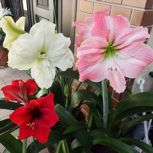 今日のお花、アマリリスです😊 こちらも先月の写真ですが、ガーデンオーケストラシリーズのスプリングジュエルとアラスカです💕🤍 一枚目はスプリングジュエル、小輪ですが丈夫で沢山のお花を長い間咲かせてくれます😍アラスカは、八重の白花で、写真だと前出のマリリンに似ていますが、一回り小輪です。ガーデンオーケストラシリーズは小輪ですが丈夫で耐寒耐暑性があり、地植えで冬を越す事ができます(高冷地、寒地は除く)。 五枚目後方は前出のバルバドスですね😊