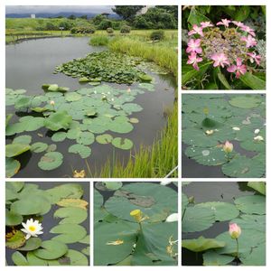 今日のお花ハスです🪷 前出の、せせらぎの郷ひょうたん池のハスとスイレン、アジサイです😊 左下の小さい写真はスイレン、右上はほぼ終わっていた中、名残りのように咲いていたガクアジサイです。 不具合で複数投稿が出来ないのでコラージュにしました😁
