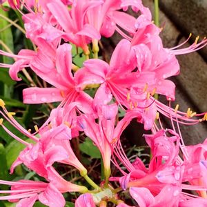 ピンクワールドへようこそ〜💓 前出のリコリス ウエキ一号に続いて開花したのは、とても良く似た、ジャクソニアナ・ロゼ(多分)です♪これも同じ理由で、多分になってます😅💦 弁端の青みが無いので、多分これはジャクソニアナ・ロゼじゃないかなと思っています。 前出のアルビピンクのように個性的な色合いの場合は、確定的な事が言えるのですが、ピンク系は本当に似た品種が多くて、しかも 一時はまっていた時にあほみたいに色んな品種を集めていて、鉢植えの時はまだ区別がついたのですが、地植えにしたらもう、札は飛んでなくなるわ、記憶もさだかでなくなるわで・・・💦 引っ越して来る時、なんとか連れて来れた品種が、多分これかなあという感じです🥲 でも、想像していたよりちゃんと根付いて、開花もしてくれたのがとても有り難いですね〜生命力に感謝です😁💕