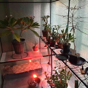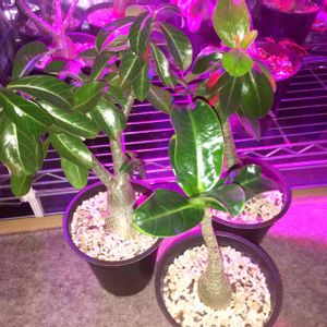 温室組のアデニウム 葉っぱテッカテカ✨ LEDライトの色が怪しさ全開‼️