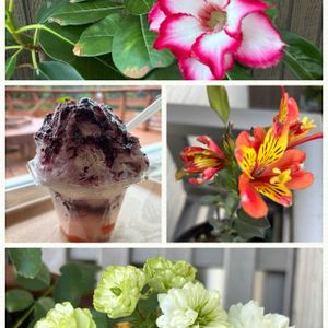 おはようございます😊 今日も朝から蝉時雨。花木の水遣り、掃除機掛けたら滝の汗💦梅ジュース飲んで一息😌 ベランダやフラワーボックスの花です♪ ⬆️「アデニウム」花が2つ咲きましたー🌸🌸 ➡️密かに「アストロメリア」が咲いてます❣️ ⬅️昨日、畑の帰りに立ち寄った「ナナファーム(ブルーベリー園)」のカキ氷。今、食べたーい‼️ ⬇️剪定してた「ミニバラ グリーンアイス」花が咲いてます🌹