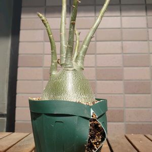あちゃー✧\(>o<)ノ✧ やっちまった〜😅 アデニウムちゃんは冬はお家の中が多いと思いますが、うちはお外なんです💪 寒くなる頃鉢がパンパンに膨らんでいたけど休眠するからいっかー(言い訳w)とプチプチを巻いて二重鉢で冬越ししました🎶 で、プチプチを取ったらこの有様でございます😰 早速5号鉢に植え替え(2枚目pic) 白い鉢にしたらカッコよくなりました🥰 お迎えしてからもう時期2年ですが、まだお花が咲いてません🥲 今年は咲いて欲しいな〜🩷