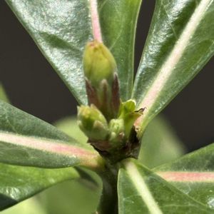 今日は薄曇りな日でした☁️ 去年(2024年)の6月に強剪定を施し、丁度1年。 今は大中小の4頭で成長しております🌿 濃いめの艶々な肉厚の葉が良い感じ😁 まだまだ小さいですが蕾らしき物を確認出来ます👀