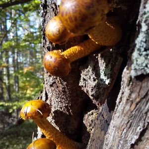 木を見上げたら、つやつやなコ達🍄 ヌメリスギタケモドキ🍄 食すことが出来、調理万能だそうです。 それにしてもキミ達ツヤツヤね✨ 乾燥気味な私からすると羨ましい🥺 ツヤツヤなときって ワセリン塗ったくった時くらいかしら(笑)