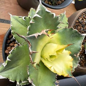 おはようございます( ´ ▽ ` )ノ☀️ 今日は「品種(名)が沢山ある多肉植物さん」のお写真をば…🤗🎶 1枚目は…強刺のアガベ代表格でもあり、とても人気が高くコレクターの方も多いアガベ・チタノタさんです🥰💕 私は「お庭で でっかいアガベを育てたい♡」と耐寒性の高い品種ばかりに目が行ってたんですけど…… やっぱり強刺のチタノタさんは格好いい😍💖と思って、とりあえず 黒っぽい刺の品種と白っぽい刺の品種をお迎えして 育て始めました(*^^*)💓 (全て発根済みのちびっ子です😅) 一目惚れするような株に出会ったら お迎えしちゃうかもしれないんですけど、根っこのない輸入のベアルート株は初心者🔰には敷居が高くて…(;^_^A💦 でも、チタノタさんって 本当に色んな品種があるみたいなので、今回はチタノタの種類について 少し調べてみました😉🎶 チタノタさんには、大別すると2種類あって、あんまり強刺でないランチョタンバー系と言われるホワイト・アイスさんやブルーさん達の仲間と、いかにも強刺って感じのオテロイ系(FO-076系)の子達に分かれるらしいです😲☝️ でね…… どっかの農業大学の人が管理する時に、このオテロイ系の強刺の子を『No.1』とか番号札をつけて管理してたらしくて、日本では強刺のチタノタさんには「ナンバー・ワン」とか「農大」とか言われてる品種もあるみたい😳‼️ ややこしい(「難しい」の関西弁💦)のは、チタノタ・ブルーは強刺じゃないけど、我家のチタノタ・ブラック&ブルー(別名:ブルーボール選抜種)は 強刺ちゃんの仲間なんだそうです(;^_^A オテロイ系の強刺チタノタさんの中にも 色んな品種が あって…… ブラック&ブルーのように黒っぽい刺の子と白鯨のように白っぽい刺の子、所謂その中間的な刺色(チョット茶色が混ざる白刺?)の子を見かけます👀 葉色も豊富で、黄覆輪の子や黄中斑の子が「○○錦」として市場に出回ってたり、矮性品種の「姫厳竜」なんて品種もあって、サイズも色々あるみたいです🤗✨ 更に更に…… ストレスをかけると真っ赤に紅葉する(?)レッド キャット ウィーズルなんて品種まであるらしい‼(•'╻'• ۶)۶ 時代と共に流行りもあるみたいだから……集めたい♡って思われるコレクターさん達の気持ちも分かるなぁ〜🎶 なんて思っちゃいました( •ॢ◡-ॢ)-♡ とりあえず……我家は、(超絶チビっ子のFO-076さんは「生きてますかぁ〜?!💦」と言いたくなる状態だけど)他のお二方をしっかり冬越しさせて❄️、10年かけて The チタノタ っぽく成長させられるよう、頑張ってみるつもりです(๑•̀ㅁ•́ฅ✧ だって…強刺チタノタさんって、やっぱり格好いいんだもの(∩´∀`∩)♡