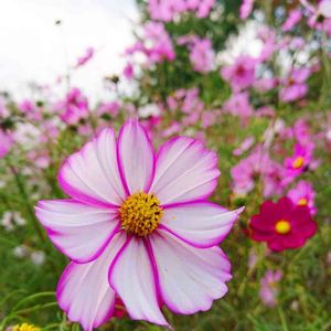 コスモス ピコティ 白色に桃赤色の縁取りや紅色に白の絞り、花径は7センチ程度 他の咲き方にも会えるかな🤗楽しみ💕
