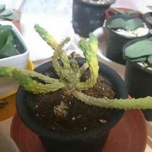 ユーフォルビア・九頭竜。冬の間に赤黒く変色してしまい、水不足でしわくんだのがなかなか戻らなかったけれど、最近枝(足?)がふっくらして、活動開始。