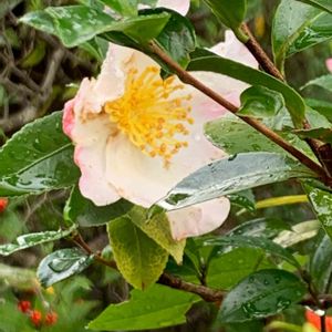 雨に打たれたサザンカ 清楚で可憐で好きな花です。雨に濡れるとよりはかなげで色っぽい⁉️