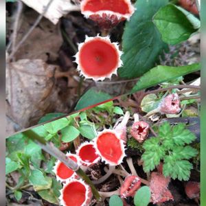 シロキツネノサカズキモドキ(白狐杯擬) *ベニチャワンダケ科 シロキツネノサカズキモドキ属 発生時期は早春!(晩秋からの事もあり) [シロキツネノサカズキは夏に発生] 多湿な半分埋もれた枯葉や枯木などから発生する! ⬆️白い柄ありワイングラスのようでもあり 森の中でキツネがこの赤いグラスで 乾杯しているのでしょうか❣️ みたいと思っていまいたが偶然出会えました❗️ 宮城県県民の森