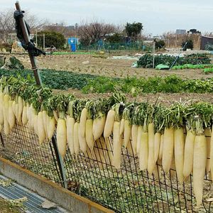 河川敷の畑で、大根が干されていました。何日くらい干したものか…白い大根が、少し、黄色っぽくなっていました。 この日、夕方から雨の予報が出ていました。 雨が降ってくる前に取り込むのかな~😓 それとも、ビニールでもかけて、雨に濡れるのを防ぐのかな…😓とか、いらん心配をしながら、しばし、眺めていました。